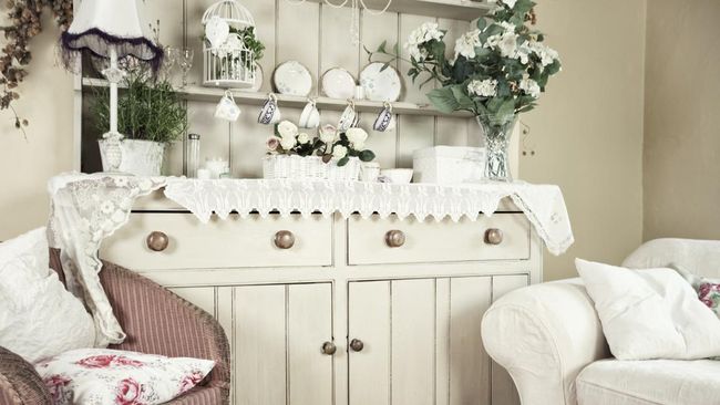 Rumah shabby chic menggabungkan unsur-unsur seperti warna-warna pastel yang lembut, furnitur dengan tampilan yang usang namun berkelas, serta perabotan dan aksesori dengan sentuhan yang kasar atau mengelupas.