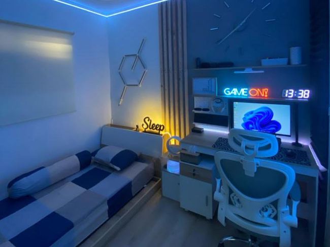 Untuk desain kamar tidurnya, Rifqi hanya melihat-lihat inspirasi dari aplikasi Pinterest saja dan menerapkannya sendiri. Niat awalnya, ia ingin membuat kamar tidur dengan gaya minimalis atau skandinavia, namun hasil akhirnya menjadi terlihat modern dengan berbagai lampu LED yang ada di kamarnya. Meski demikian, ia mengaku tetap puas atas renovasi yang dilakukannya.