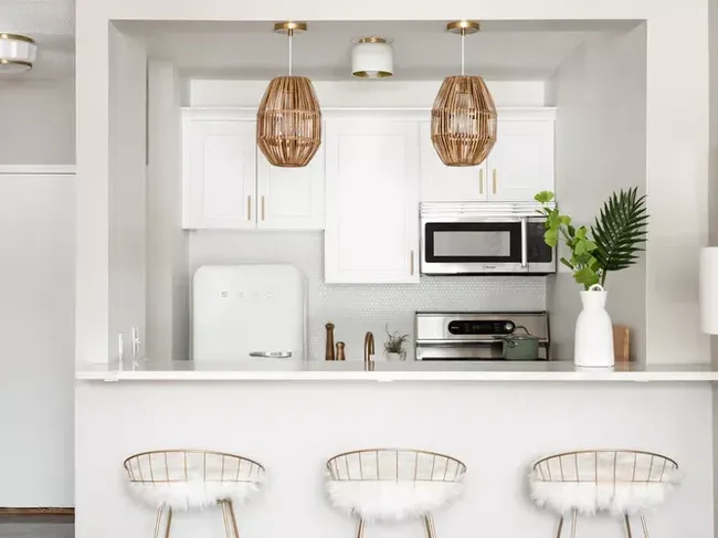 Interior yang serba putih pada tembok dan peralatan dapur dapat membuat dapur terasa lebih luas. Warna putih cenderung memantulkan cahaya, sehingga menciptakan kesan lebih banyak ruang. Gunakan beberapa nuansa warna putih dan kombinasikan dengan tekstur yang kontras agar dapur tidak terasa terlalu polos.