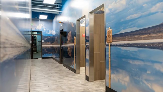 Pelanggan Maverik melewati pemandangan alam dalam perjalanan ke toilet. Desain seperti ini menciptakan suasana yang menenangkan bagi pengunjung.