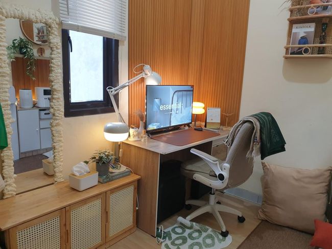 Untuk menambah kesan warna hangat pada ruangan, mereka menambahkan lampu meja, lampu lantai, dan lampu LED. Zakia memperkirakan pengeluaran untuk mengisi dan mendekor interior kontrakan bisa senilai Rp 15 juta.
