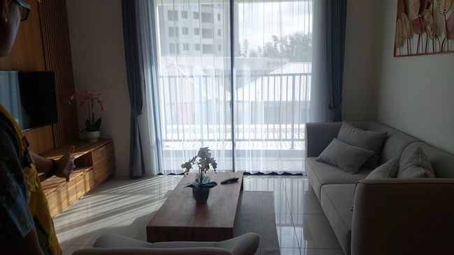 Saat membuka pintu, penghuni langsung disuguhkan area kerja dengan furniture yang terbuat dari kayu. Di sampingnya, terdapat ruang keluarga yang sudah dilengakapi dengan TV, sofa, meja, dan ada balkon juga. Ketika diduduki, sofa berwarna abu-abu itu terasa agak keras sementara kursi di sampingnya terasa empuk dan nyaman.