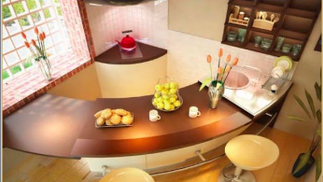 Kitchen set dan semi minibar lengkung bisa diletakan di sudut ruang. Dibentuk seperempat lingkaran, semi minibar memiliki kabinet bawah.