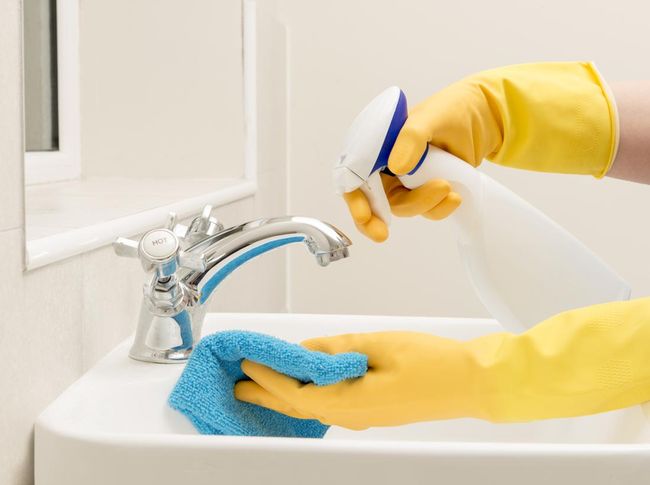 Singkirkan barang-barang yang memenuhi area wastafel. Lalu, bersihkan wastafel menggunakan cairan pembersih. Pastikan untuk membilas area wastafel dengan bersih dan keringkan.