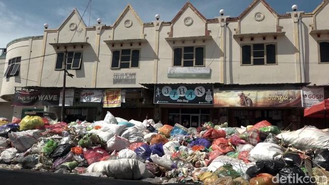 Pantauan detikcom, Jumat (18/3/2022), tumpukan sampah tersebut berasal dari pedagang dan limbah rumah tangga. Tumpukan sampah menggunung di tengah pasar dengan ketinggian mencapai 1,5 meter.