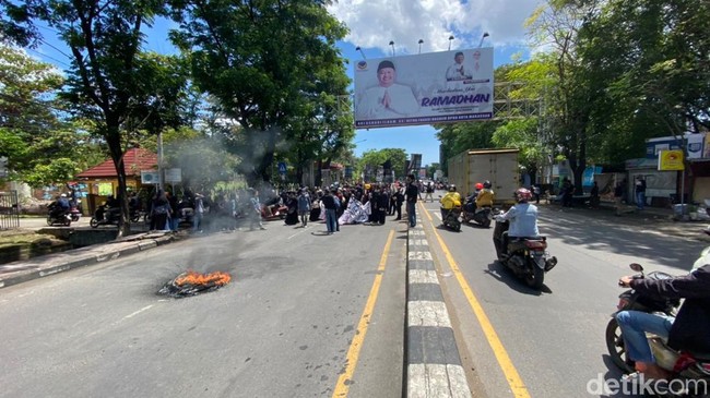 Pantauan detikSulsel di depan Kampus 1 UIN Alauddin Makassar, Jalan Sultan Alauddin, Senin (11/4/2022) pukul 12.30 Wita, massa aksi dari Himpunan Mahasiswa Jurusan Perencanaan Wilayah dan Kota (HMJ PWK) menutup satu lajur jalan. Lajur jalan ditutup dari arah Kabupaten Gowa menuju Jalan AP Pettarani.