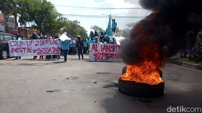 Sejumlah mahasiswa yang ikut aksi tampak membentangkan spanduk berisi tuntutan. Salah satunya bertuliskan "Cukup 2 Periode Bestie #Sessajaki#.