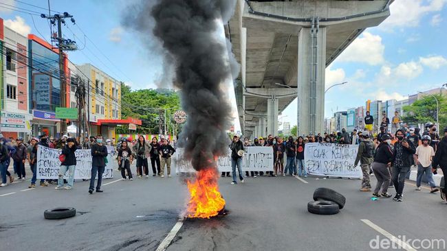 Massa mahasiswa membakar ban di tengah jalan dan membentangkan sepanduk berisi tuntutannya.