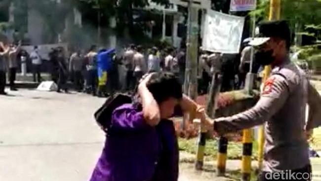 Mahasiswa mengecam tindakan represif yang dilakukan polisi saat pengamanan demo 11 April di Enrekang, Sulawesi Selatan (Sulsel). Mahasiswa menuntut Kapolda Sulsel mengusut personel yang menonjok seorang massa dari mahasiswa.