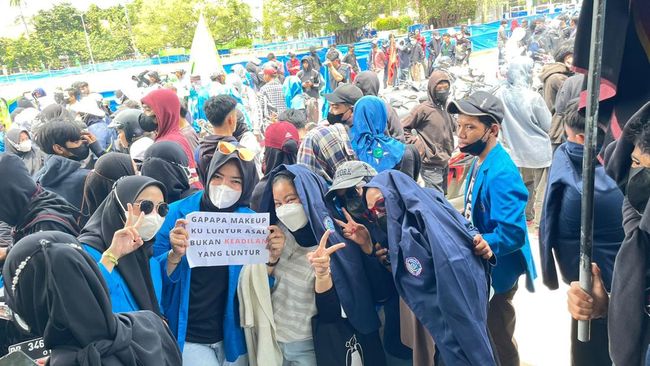 Sejumlah mahasiswa perempuan tampak berpose memegang lembaran kertas dalam aksi demo 11 April. Di kertas tersebut bertuliskan, "Gapapa Makeup-ku Luntur Asal Bukan Keadilan yang Luntur."