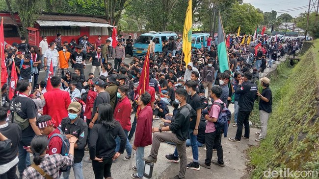 Pantauan detikcom di depan Kantor DPRD Sulut, Jalan Raya Manado-Bitung pada Selasa (12/4/2022) massa aksi sudah mulai berdatangan sekitar pukul 15.10 Wita. Massa aksi yang berada di lokasi pun langsung menduduki hampir seluruh badan jalan.
