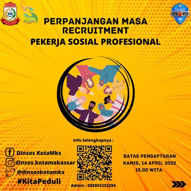 Dinas Sosial (Dinsos) Kota Makassar membuka rekrutmen tenaga pekerja sosial profesional. Lowongan pekerjaan untuk menjalankan program rehabilitasi sosial sub kegiatan pemberian bimbingan fisik, mental, spiritual, dan sosial tahun anggaran 2022.