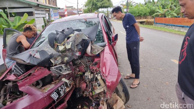 Sebuah mobil di Kabupaten Bone, Sulawesi Selatan (Sulsel) Baleno rusak parah usai menabrak pohon gegara pengemudi hilang kendali. Kecelakaan tersebut mengakibatkan 5 penumpang termasuk sopirnya luka-luka hingga dilarikan ke rumah sakit.