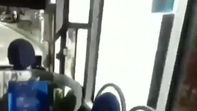 Di potongan video kedua yang juga direkam penumpang, tampak dalam video tiba-tiba datang pria mengenakan topi dan baju kaus berwarna oranye memecahkan kaca samping bus dengan batu. Gerakannya cepat.