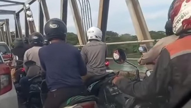 "Kondisi arus lalin sepanjang Jembatan Barombong lumpuh total (tadi pagi)," ujar Iman.