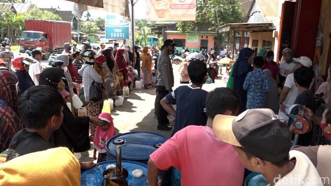 Distributor minyak goreng curah di Kabupaten Polewali Mandar (Polman), Sulawesi Barat (Sulbar), diserbu warga. Mereka rela berdesakan antre di bawah teriknya matahari demi mendapatkan minyak goreng curah yang dijual dengan harga murah.