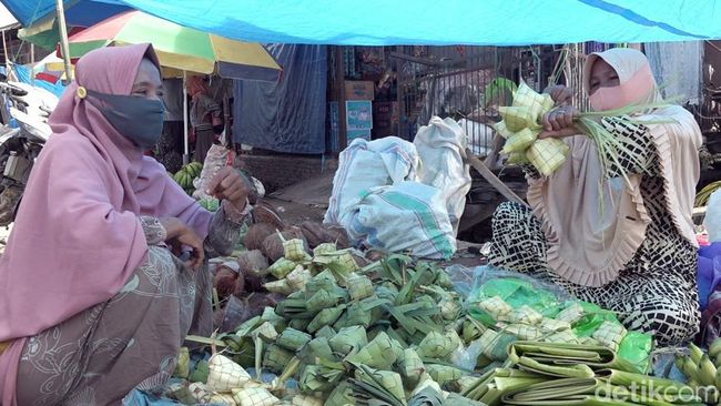 Pantauan detikcom, Sabtu (30/4/2022), pedagang kulit ketupat dan daun pisang ramai terlihat di Pasar Marasa, Kecamatan Wonomulyo. Tampak belasan penjual kulit ketupat dan daun pisang, menjajakan dagangan di pelataran dan bahu jalan sekitar di pasar ini.