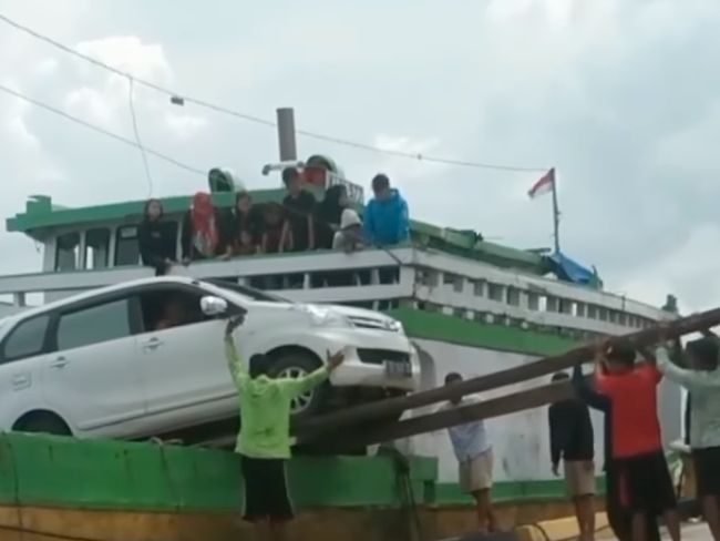 Dalam video viral berdurasi 2 menit 20 detik, tampak sebuah mobil minibus warna putih tengah diturunkan dari sebuah kapal kayu. Warga berjibaku membantu menurunkan mobil itu.