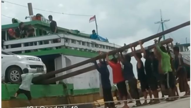 Dalam video viral berdurasi 2 menit 20 detik, tampak sebuah mobil minibus warna putih tengah diturunkan dari sebuah kapal kayu. Warga pun berjibaku membantu menurunkan mobil itu.