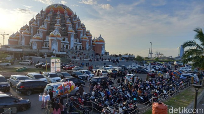 Kawasan Center Point of Indonesia (CPI) Makassar, Sulawesi Selatan (Sulsel) dipadati pengunjung di tengah puncak libur Lebaran. Petugas Satpol PP mengawasi potensi adanya juru parkir (jukir) liar yang bisa mengganggu pengunjung Masjid 99 Kubah dan kawasan kuliner Lego-lego.
