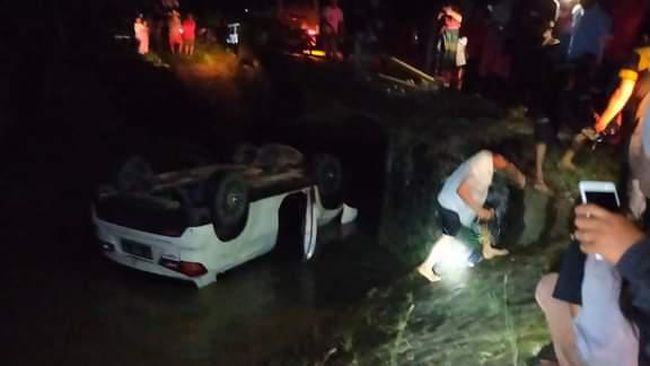 Sebuah mobil mini bus di Kabupaten Bone, Sulawesi Selatan (Sulsel) terjun ke sungai. Sopir mengantuk sehingga membanting setir saat melintasi jembatan.
