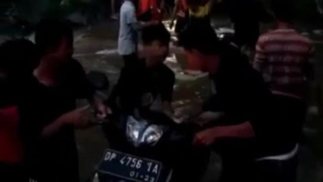 Tampak seorang warga dibantu tiga orang mengangkat motornya melintasi sungai. Lalu melintas di sampingnya seorang pria yang memanggul motor sendiri melintasi sungai yang ketinggian airnya setinggi lutut orang dewasa.