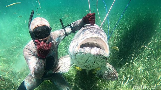 Buton - Nelayan di Buton, Sulawesi Tenggara (Sultra), Haris menyita perhatian usai menangkap ikan kerapu raksasa. Dia menaklukkan ikan berbobot 143 kilogram itu di dasar laut dengan terumbu karang yang indah.