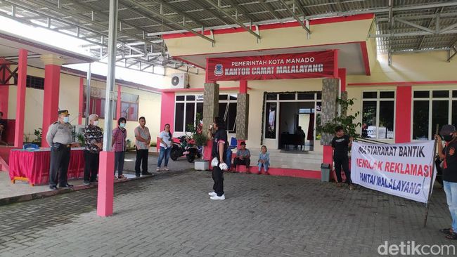 Pantauan detikcom, Kamis (9/6/2022), sejumlah massa aksi mendatangi kantor Camat Malalayang. Mereka membawa spanduk berukuran besar bertuliskan, "Masyarakat Adat Bantik Menolak Reklamasi Pantai Malalayang".