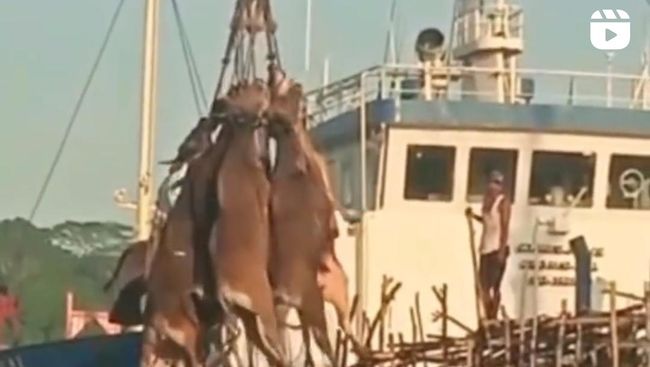 Dalam video yang dilihat detikcom, Kamis (16/6/2022), beberapa sapi yang berada di atas sebuah kapal diangkut dengan cara kepalanya diikat lalu disangkutkan ke crane.