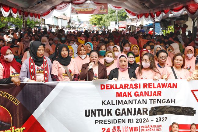 Sejumlah relawan emak-emak yang tergabung dalam Mak Ganjar Kalimantan Tengah mendeklarasikan dukungan kepada Ganjar Pranowo untuk maju di Pilpres 2024, Jumat (24/6). Dukungan tersebut diberikan karena mereka menilai Ganjar memiliki sifat yang bisa merangkul semua golongan.