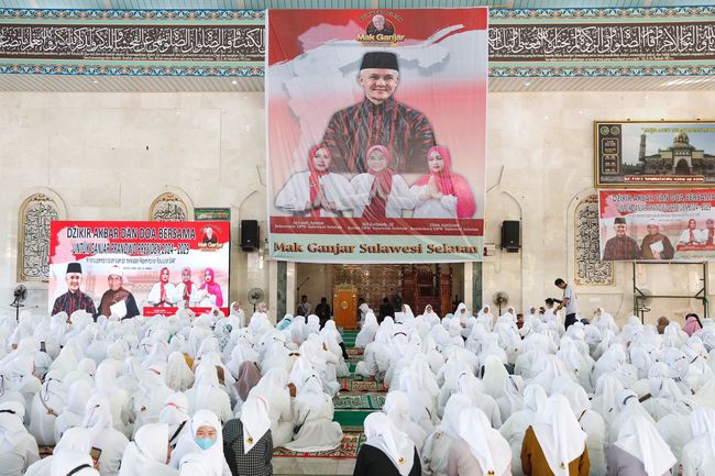 Relawan pendukung Ganjar Pranowo yang tergabung dalam Mak Ganjar Sulawesi Selatan (Sulsel) menggelar zikir akbar dan doa bersama. Kegiatan ini dilakukan untuk mendoakan Gubernur Jawa Tengah, Ganjar Pranowo, menjadi Presiden Republik Indonesia 2024-2029.