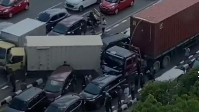 Usai truk kontainer tersebut menabrak mobil boks di depannya, sejumlah mobil lainnya ikut tertabrak. Akhirnya, kecelakaan beruntun tak bisa terhindarkan.