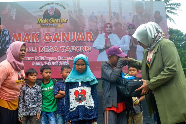 Ratusan emak-emak yang tergabung dalam Mak Ganjar Sulsel menggelar baksos di Desa Tapong, Kecamatan Tellu Limpoe, Kabupaten Bone, Jumat (8/7). Ketua Umum Dewan Pengurus Nasional Mak Ganjar, Nining mengungkapkan pihaknya menggelar baksos untuk menebar manfaat, terlebih usai mendengar kisah Yuddin dan Nursabbi.