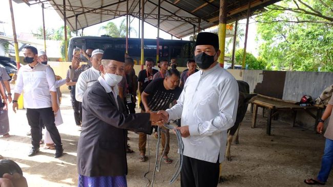 Penyerahan sapi kurban dilakukan Kapolda Sulsel Irjen Nana Sudjana di Mapolda Sulsel, Jalan Perintis Kemerdekaan, Makassar. Irjen Nana disebut ikut menyumbang 1 ekor sapi.