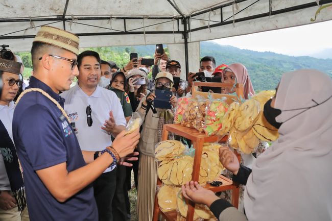 Menteri Pariwisata dan Ekonomi Kreatif (Menparekraf) Sandiaga Uno ditantang memberikan nama kerupuk ubi produk UMKM di Desa Wisata Lonuo Bukit Arang, Kecamatan Tilongkabila, Kabupaten Bone Bolango, Gorontalo, Rabu (13/7).
