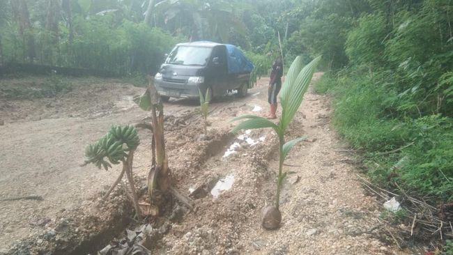 Sejumlah warga di Buton Utara, Sulawesi Tenggara (Sultra) protes ruas Jalan Poros Bonegunu-Kambowa rusak parah tak kunjung diperbaiki. Warga yang kesal lantas menanam pohon pisang dan kelapa di ruas jalan tersebut.