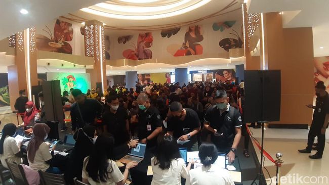 Pantauan detiksulsel di lokasi, Sabtu (30/7/2022), antrean panjang mewarnai tempat penukaran tiket di Transmart, TSM, Makassar. Antrean panjang ini terlihat bahkan sebelum pelayanan penukaran tiket dibuka oleh panitia.