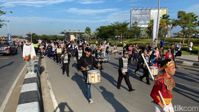 Marching Band Gita Swara Pembangunan SMK Negeri 5 Makassar mengiringi perjalanan peserta jalan sehat launching detikSulsel di Makassar, Sulawesi Selatan (Sulsel). Para peserta semangat dalam perjalanan karena diiringi musik dari kelompok siswa tersebut.