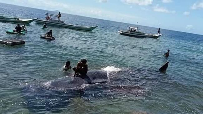 "Kemarin sudah dievakuasi sama masyarakat dan pemerintah setempat cuman memang setelah digiring keluar (tengah laut) dia tetap masuk lagi (ke tempat semula). Katakan ikannya sudah kurang kuat, sudah berumur," ucap Rahman.