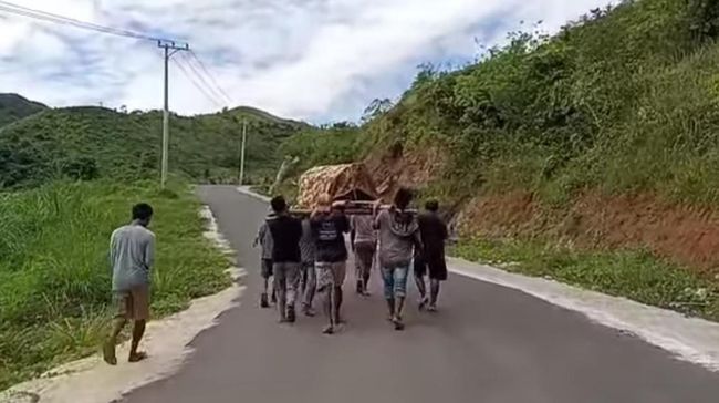 Dalam video yang beredar, tampak sekelompok pria membawa jenazah dengan cara ditandu. Mereka tampak mengusung keranda di sebuah ruas jalan yang sepi tanpa dilalui kendaraan.