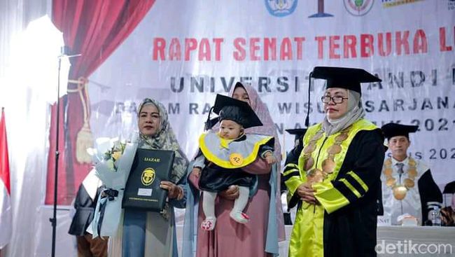 Kimberly Batari mengenakan toga saat acara wisuda di Universitas Andi Djemma (Unanda), Palopo, Sulawesi Selatan, pada Senin (8/8/2022). Bayi berusia 5 bulan itu maju ke panggung sembari digendong oleh neneknya.