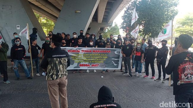 Pantauan detikSulsel di lokasi aksi, Senin (5/9/2022), massa aksi dari Forum Bugis Makassar Sulsel mulai merapat ke Fly Over sekitar pukul 13.50 Wita. Mereka datang dari arah Taman Makam Pahlawan, Jalan Urip Sumoharjo.