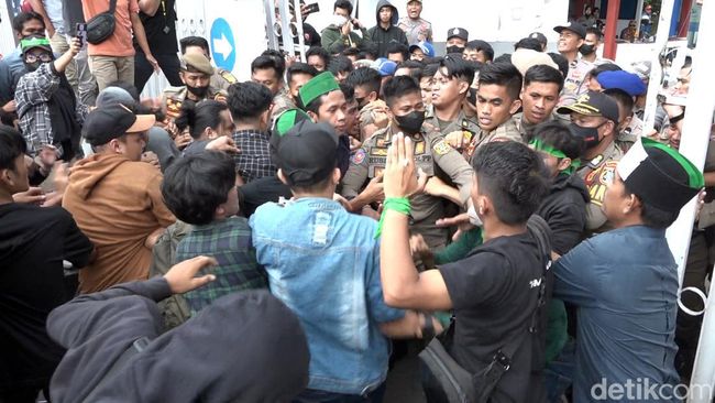 Akibatnya terjadinya aksi saling dorong antara mahasiswa dan petugas keamanan.