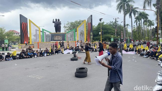 Pantauan detikSulsel, Selasa (6/9/2022) sekitar pukul 15.30 Wita puluhan mahasiswa melakukan aksi di depan Monumen Cinta Sejati Habibie-Ainun, Jalan Bau Massepe.