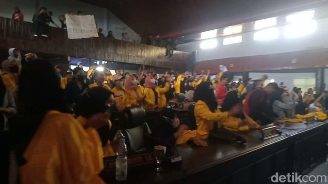 Mahasiswa Universitas Cokroaminoto Palopo, Sulawesi Selatan (Sulsel) merangsek masuk ke kantor DPRD Kota Palopo untuk menyampaikan tuntutan penolakan kenaikan harga BBM. Massa kemudian diterima Ketua DPRD Kota Palopo, Nurhaenih di ruang rapat paripurna.