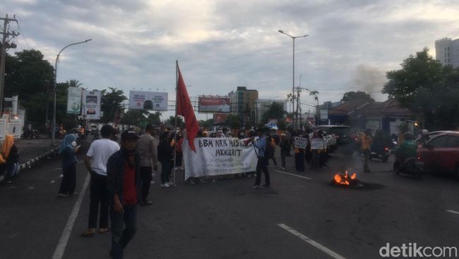 Pantauan detikSulsel, Rabu (7/9/2022), massa mahasiswa asal UNM menutupi setengah badan Jalan AP Pettarani Makassar sekitar pukul 17.20 Wita. Spanduk yang bertuliskan tuntutan aksi massa dibentangkan di jalan.