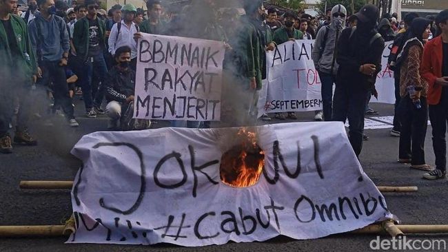 Mahasiswa di Makassar, Sulawesi Selatan (Sulsel) membawa keranda mayat Jokowi saat demo tolak kenaikan harga BBM. Keranda mayat itu dibawa oleh mahasiswa dari tiga almamater kampus ke depan gedung DPRD Sulsel kemudian dibakar.