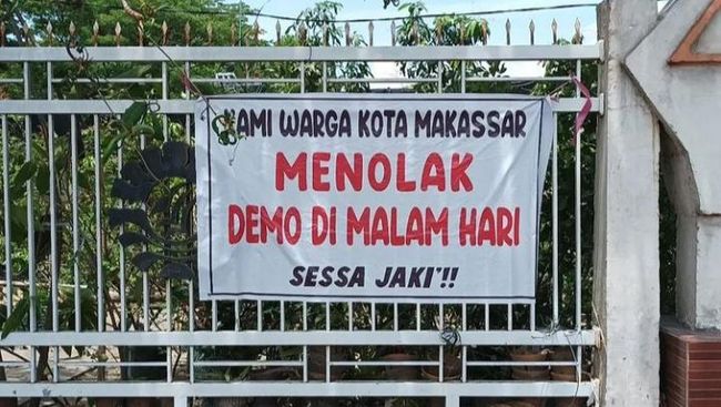 Viral di media sosial sebuah spanduk mengatasnamakan warga Kota Makassar, Sulawesi Selatan (Sulsel) menolak demonstrasi di malam hari. Spanduk tersebut terpasang di pagar kampus Universitas Negeri Makassar (UNM).