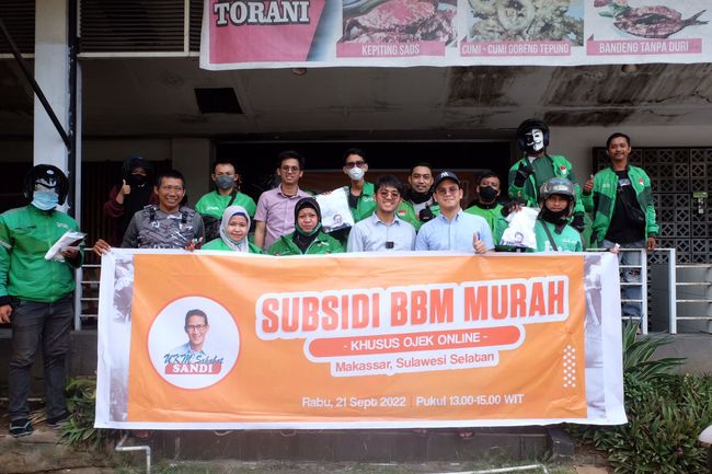 Melihat hal ini, relawan UKM Sahabat Sandi Makassar memberikan bantuan berupa voucher BBM murah subsidi pembelian BBM jenis pertalite dengan harga miring Rp 2.000/liter di SPBU Racing, Kota Makassar, Sulawesi Selatan, Rabu (21/9). Bantuan yang bertujuan guna meringankan beban para driver ojol ini mendapat respons positif dari para ojol.