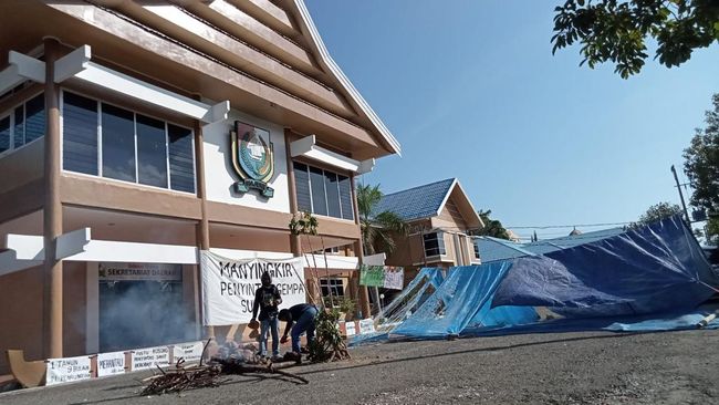 Warga mendesak Pemkab Majene, Sulawesi Barat (Sulbar) segera menyalurkan bantuan stimulan untuk korban gempa yang masih bertahan di lokasi pengungsian. Mereka menggelar aksi unjuk rasa dengan mendirikan tenda di depan Kantor Bupati Majene.